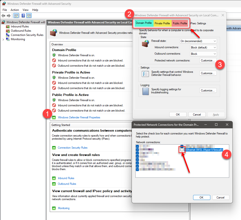 - under each profile (i.e. “Domain”, “Private” and “Public”), “customize” the “Protected network connections”